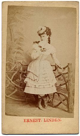 A photo circa 1875 of Ernest Linden, female impersonator, dressed as for performances for this photo.