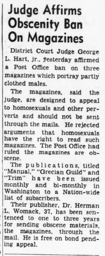 The Evening Star, a newspaper in Washington D.C., covers a ruling by District Court Judge George L. Hart Jr. which continues a United States Post Office ban on magazines "designed to appeal to homosexuals and other perverts... He rejected arguments that homosexuals have the right to read such magazines. (August 16, 1960).