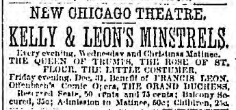 current00:33, 15 August 2022Thumbnail for version as of 00:33, 15 August 2022345 × 161 (71 KB)Archiveadmin (talk | contribs)The Chicago Daily Tribune reports on Kelly & Leon's performance at New Chicago Theatre in 1875. Library of Congress, Chicago Daily Tribune (1875), [https://chroniclingamerica.loc.gov/lccn/sn84031492/1875-12-21/ed-1/seq-7/ "New Chicago Theatre"] =Related Pages= * Francis Leon (1844-1922) =Full Text= NEW CHICAGO THEATRE. KELLY & LEON'S MINSTRELS. Every evening, Wednesday and Christmas Matinee. THE QUEEN OF TRUMPS, THE ROSE OF ST. FLOUR, THE LITTLE COSTUMER. Friday evening, Dec. 31, B...