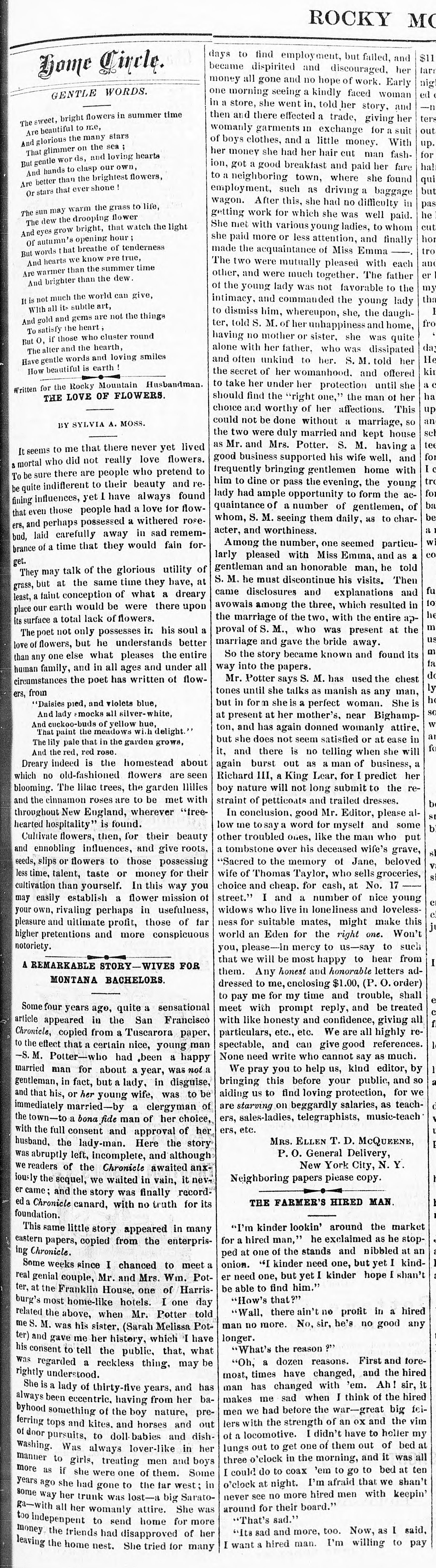 Library of Congress, "Rocky Mountain husbandman, September 01, 1881, Page 5, Image 5": "Remarkable Story - Wives For Montana Bachelors"