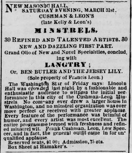 | current | 23:00, 14 August 2022 | 434 × 502 (266 KB) | Archiveadmin (talk | contribs) | The Staunton Vindicator, a Virginia newspaper, reports on Frank Cushman and Francis Leon holding a show at the New Masonic Hall in 1883. =Related Pages= * Francis Leon (1844-1922) =Full Text= NEW MASONIC HALL, SATURDAY EVENING, MARCH 31st. CUSHMAN & LEON'S (late Kelly & Leon's) MINSTRELS. 30 REFINED AND TALENTED ARTISTS. 30 NEW AND DAZZLING FIRST PART. Grand Olio of New and Novel Specialties, concluding with LANGTRY; Or, BEN BUTLER AND THE JERSEY LILY. (S... |
