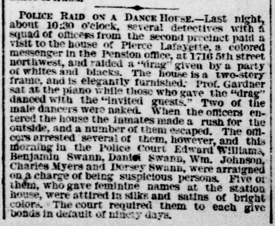 Police Raid On A Dance House-- Last night, about 10:30 o'clock,several detectives with a squad of officers from the second precinct paid a visit to the house of Pierce Lafayette, a colored messenger in the Pension office, at 1716 5th street northwest, and raided a 'drag' given by a party of whites and blacks. The house is a two-story frame, and is elegantly furnished. Prof. Gardner sat at the piano while those who gave the 'drag' danced with the 'invited guests.' Two of the male dancers were naked. When the officers entered the house the inmates made a rush for the outside and a number of them escaped. The officers arrested several of them, however, and this morning in the Police Court Edward Williams, Benjamin Swann, Daniel Swann, Wm. Johnson, Charles Myers and Dorsey Swann, were arrainged on a charge of being suspicious persons. Five of them, who gave feminine names at the station house, were attired in silks and satins of bright colors. The court required them to each give bonds in default of ninety days.