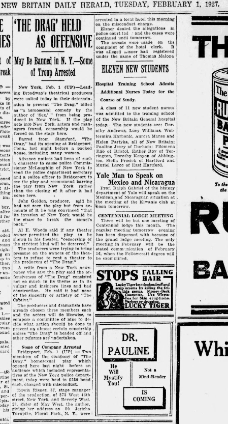 Library of Congress, "New Britain herald, February 01, 1927, Page 4, Image 4": "'The Drag' Held As Offensive - May Be Banned in N.Y. - Some of Troup Arrested"