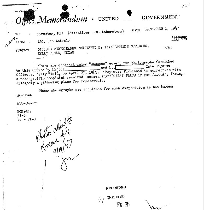 | current | 02:06, 12 September 2022 | 851 × 876 (83 KB) | Archiveadmin (talk | contribs) | === Related Pages === * FBI Activity On LGBTQIA Organizations (USA) === Full Text === Office Memorandum United States Government DATE: September 1, 1947) TO: Director, FBI (Attention: FBI Laboratory) FROM: SAC, San Antonio SUBJECT: OBSCENE PHOTOGRAPHS FURNISHED BY INTELLIGENCE OFFICERS, KELLY FIELD, TEXAS There are enclosed under "Obscene" cover, two photographs furnished to this Office by Major [redacted] and Lt. [redacted] Intelligence Officers, Kelly Field, on April 27, 1945. The... |