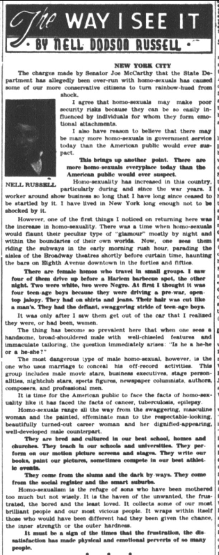 Nell Dodson Russell in the Minneapolis Spokesman writes about the allegations from Senator Joe McCarthy that the State Department is "over-run with homo-sexuals".