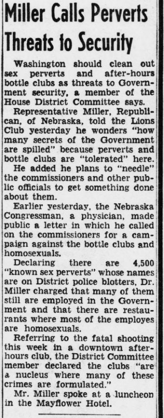 The Evening Star, a Washington D.C. newspaper, reports that Representative Miller calls for "a campaign against bottle clubs and homosexuals" (April 5, 1951).
