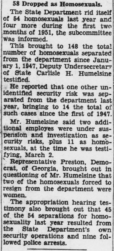 Library of Congress, "Evening star, April 26, 1951, Page A-4, Image 4": "58 Dropped as Homosexuals"