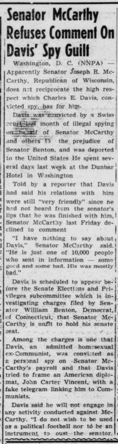 The Arizona Sun reports on a spy hired by Senator McCarthy who was allegedly "homosexual". This comes after a year of McCarthy pursuing federal agencies in the USA for hiring gay employees (November 9, 1951).