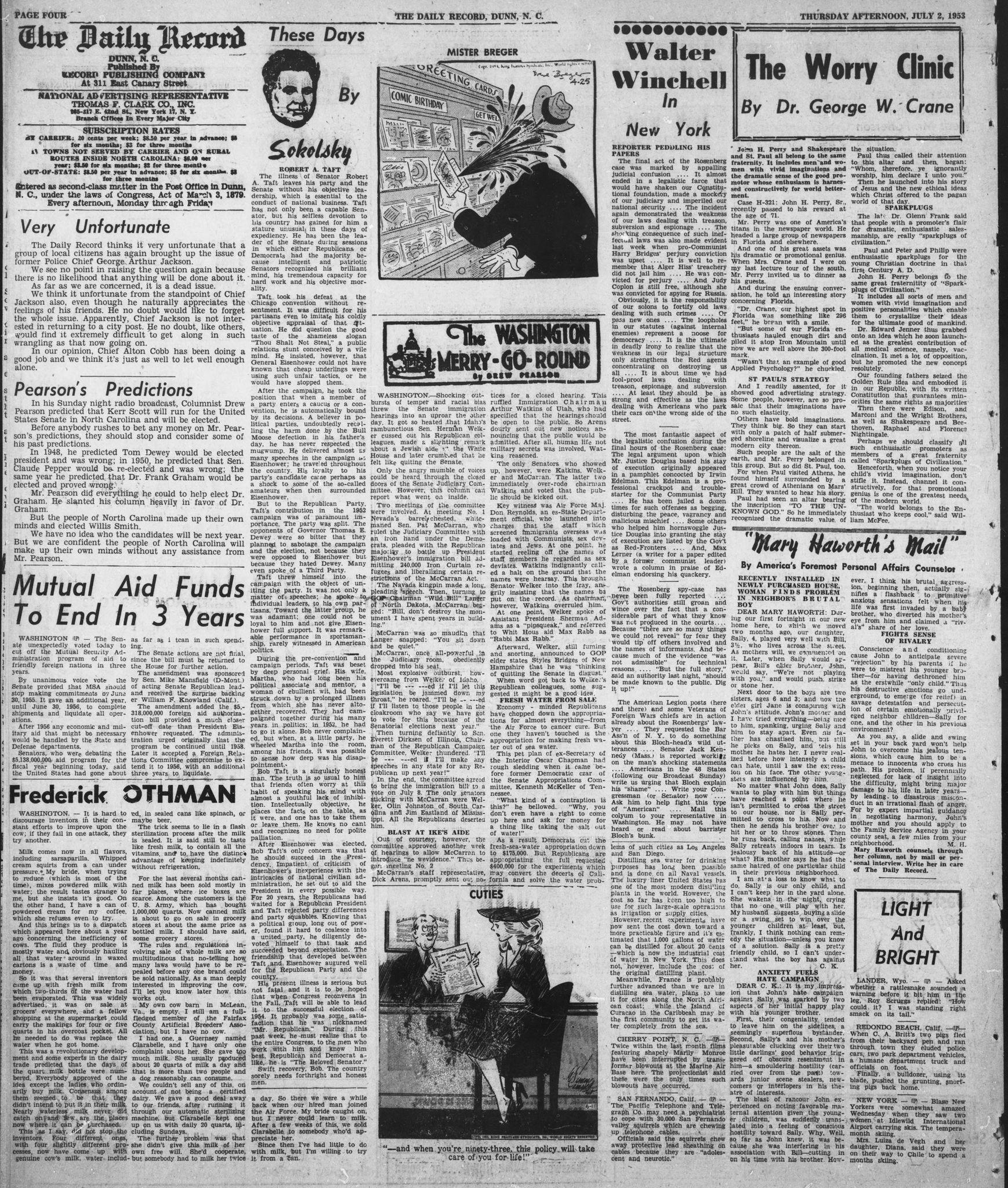 | current | 02:32, 21 September 2021 | 4,609 × 5,430 (4.48 MB) | Archiveadmin (talk | contribs) | Library of Congress, The daily record. [volume], July 02, 1953, Page PAGE FOUR, Image 4, [https://chroniclingamerica.loc.gov/lccn/sn88063132/1953-07-02/ed-1/seq-4/ "The Washington Merry-Go-Round"] * The Daily Record, a newspaper in the State of North Carolina, writes on an anti-semetic immigration law with a witness who "started reeling off the names of staff member he regarded as sex deviates" (September 20, 1953). |