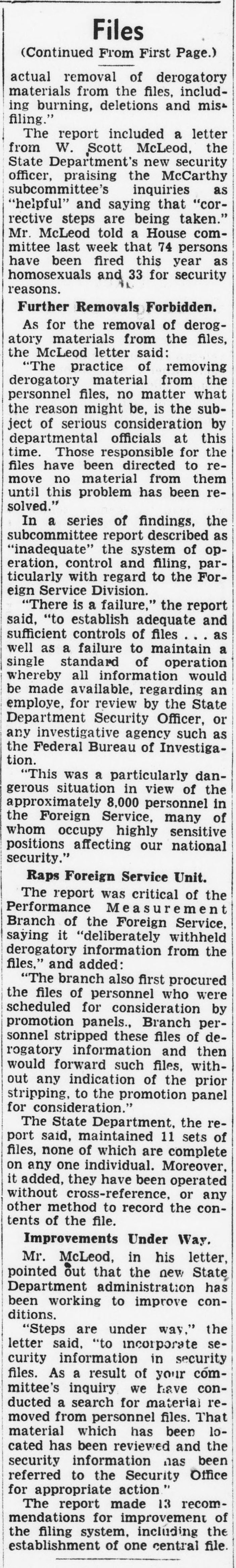 | 15:29, 17 September 2021 | 5,287 × 5,035 (3.93 MB) | Archiveadmin (talk | contribs) | Library of Congress, [https://chroniclingamerica.loc.gov/lccn/sn83045462/1953-07-05/ed-1/seq-2/ "Evening star, July 05, 1953, Image 1": "Laxity on Vital Files Charged in Report on State Department"] The Evening Star, a newspaper in Washington D.C. reports "74 persons have been fired this year as homosexuals" (July 5, 1953). |
