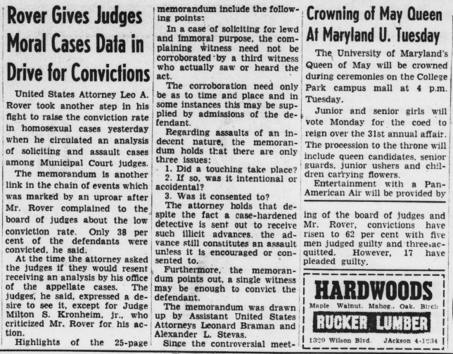 The Evening Star, a newspaper in Washington D.C., reports the United States Attorney "took another step in his fight to raise the conviction rate in homosexual cases" (May 7, 1954).