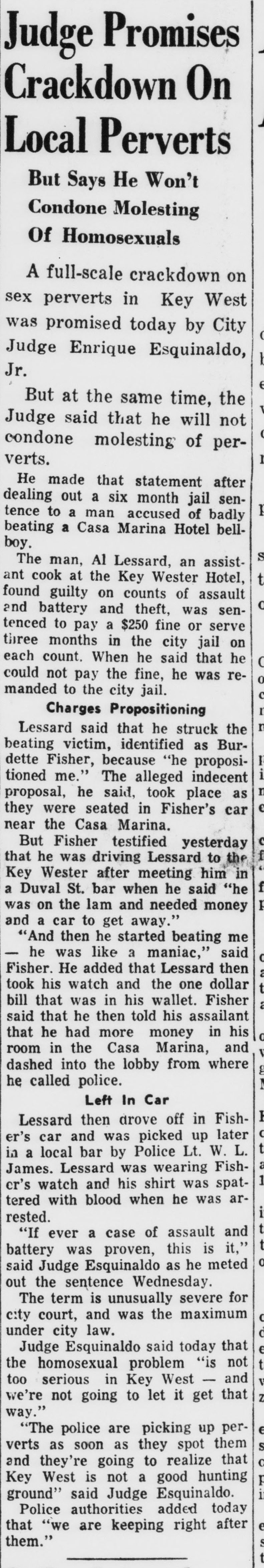 The Key West Citizen, a newspaper in the State of Florida, reports that Judge Enrique Esquinaldo Jr. will commit to a crackdown on "local perverts", says "the homosexual problem 'is not to serious in Key West -- and we're not going to let it get that way" (December 23, 1954).