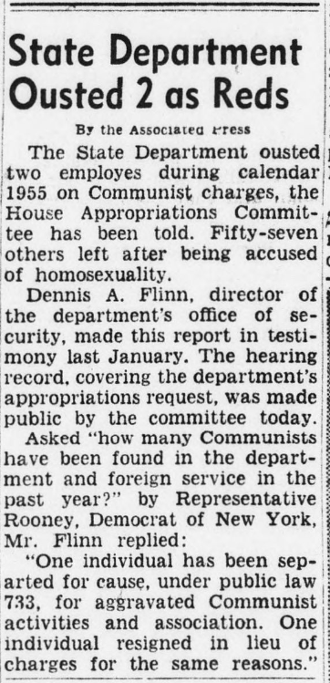 The Evening Star, a newspaper in Washington D.C., reports 2 ousted as communists and "Fifty-seven others left after being accused of homosexuality" (March 24, 1956).