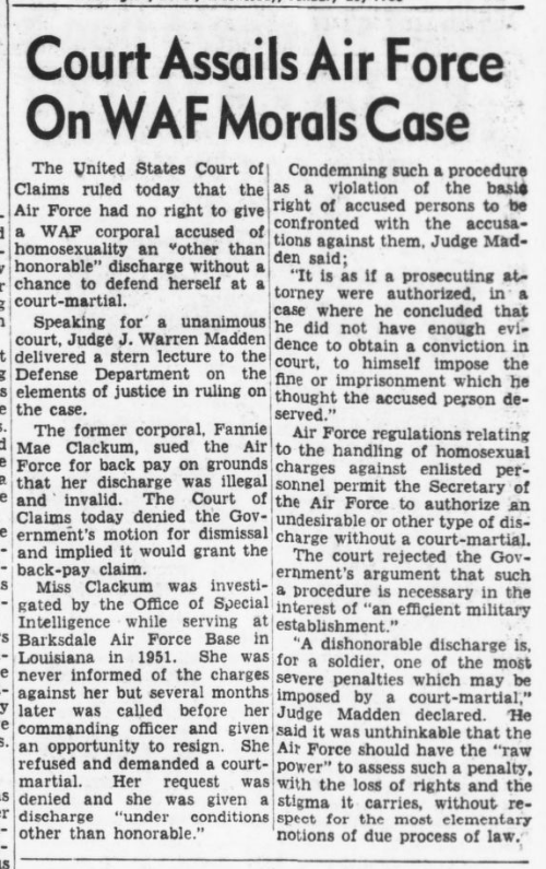 The Evening Star, a newspaper in Washington D.C., reports on the United States Court of Claims ruling that the Air Force should not have used a court martial in a case of dishonorable discharge for "homosexual charges" (January 20, 1960).