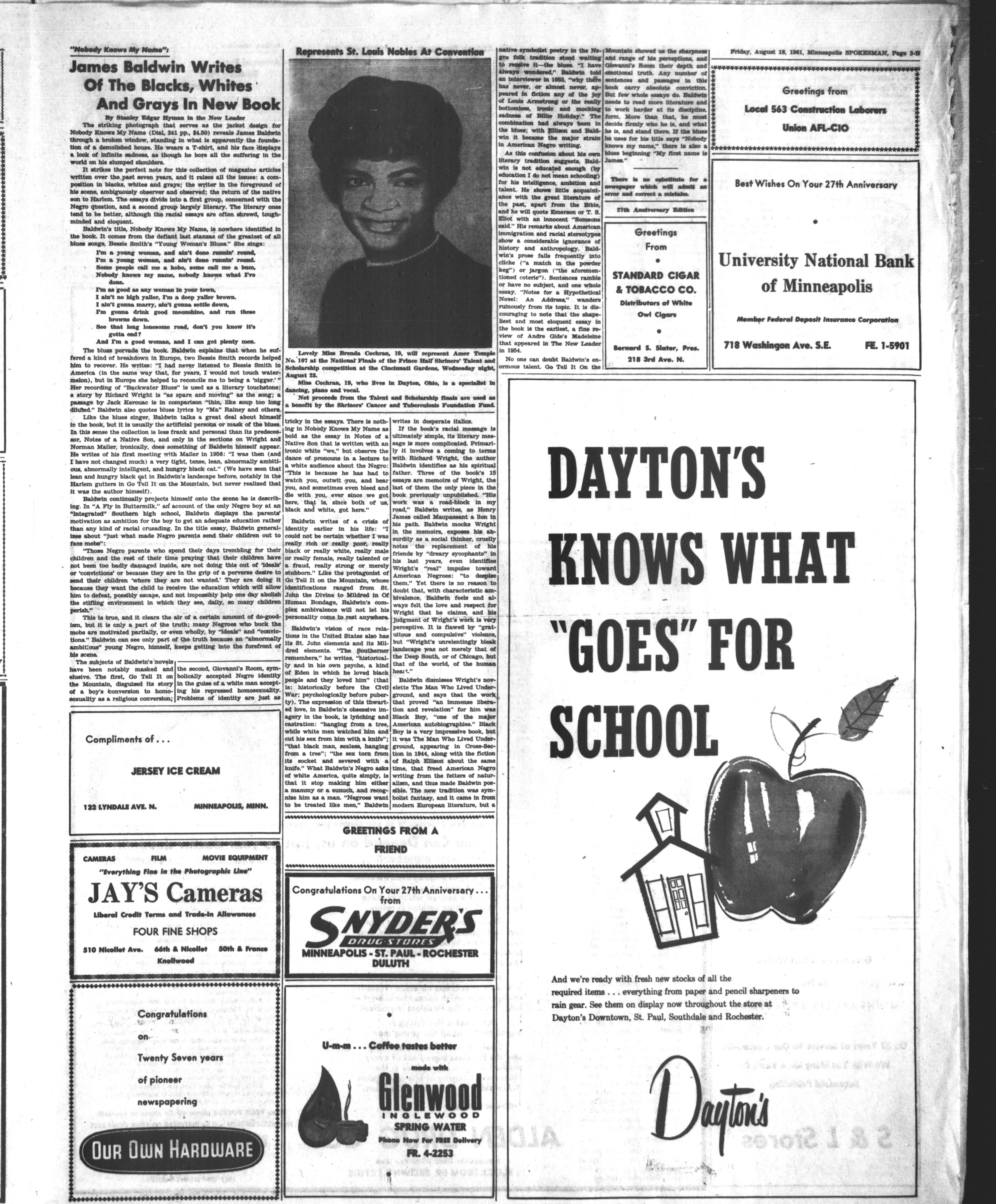 The Minneapolis Spokesman writes on James Baldwin's new release with mentions of Giovanni's Room and Go Tell It on the Mountain which have queer characters and themes (August 18, 1961).