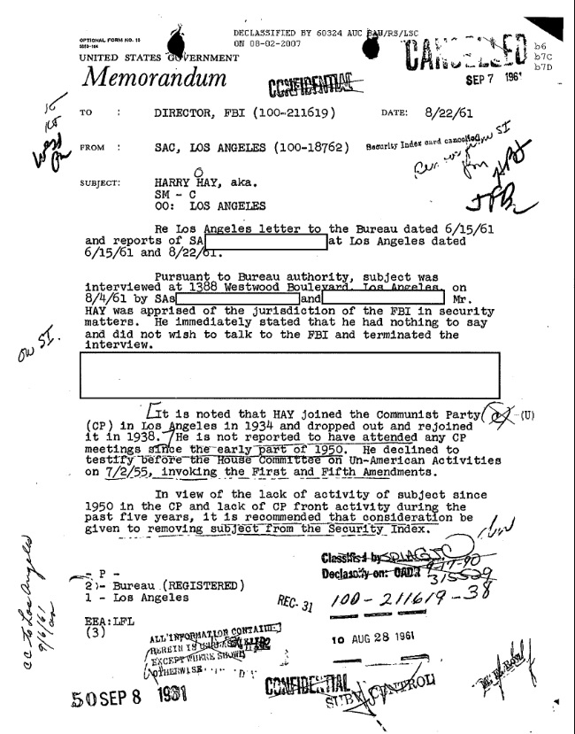 | current | 19:58, 12 September 2022 | 650 × 829 (154 KB) | Archiveadmin (talk | contribs) | Credit to Douglas M. Charles, FBI historian and author of "Hoover's War on Gays: Exposing the FBI's Sex Deviates Program". === Related Pages === * FBI Activity On LGBTQIA Organizations (USA) * Mattachine Society === Full Text === UNITED STATES GOVERNMENT Memorandum DATE: 8/22/61 TO: DIRECTOR, FBI (100-211619) FROM: SAC, LOS ANGELES (100-18762) SUBJECT: HARRY HAY, aka. SM - C OO: LOS ANGELES Re Los Angeles letter to the Bureau dated 6/15/61 and reports of SA [redacted] at Lo... |