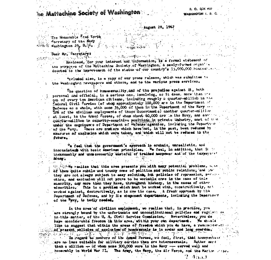 | current | 16:17, 12 September 2022 | 876 × 840 (274 KB) | Archiveadmin (talk | contribs) | Credit to Douglas M. Charles, FBI historian and author of "Hoover's War on Gays: Exposing the FBI's Sex Deviates Program". === Related Pages === * Mattachine Society === Full Text === The Mattachine Society of Washington August 28, 1962 The Honorable Fred Worth[?] Secretary of the Navy Washington 25, D.C. Dear Mr. Secretary, Enclosed, for your interest and information, is a formal statement of the purposes of the Mattachine Society of Washington, a newly-formed organization devot... |