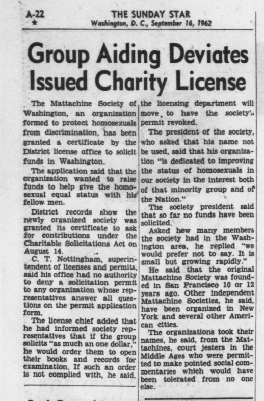 current05:02, 21 July 2022Thumbnail for version as of 05:02, 21 July 2022518 × 787 (472 KB)Archiveadmin (talk | contribs)Library of Congress, [https://chroniclingamerica.loc.gov/lccn/sn83045462/1962-09-16/ed-1/seq-22/ "The Evening Star, September 16th, 1962": "Group Aiding Deviates Issues Charity License"]
