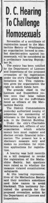 current04:55, 26 July 2022Thumbnail for version as of 04:55, 26 July 2022186 × 788 (183 KB)Archiveadmin (talk | contribs)Library of Congress, [https://chroniclingamerica.loc.gov/lccn/sn83045462/1963-09-18/ed-1/seq-66/ "Evening Star" (1963): "D.C. Hearing To Challenge Homosexuals"] =Full Text= D.C. Hearing To Challenge Homosexuals Revocation of a certificate of registration issued to the Mattachine Society of Washington, an organization formed to combat discrimination against homosexuals, will be considered at a preliminary hearing September 24. The society has been notified by the Department of Licenses and...
