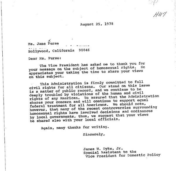 | current | 16:33, 12 September 2022 | 600 × 582 (55 KB) | Archiveadmin (talk | contribs) | Credit to Douglas M. Charles, FBI historian and author of "Hoover's War on Gays: Exposing the FBI's Sex Deviates Program". === Related Pages === * United States of America === Full Text === August 25, 1978 Ms. Jane Purse Hollywood, California 90046 Dear Ms. Purse: The Vice President has asked me to thank you for your message on the subject of homosexual rights. He appreciates your taking the time to share your views on this subject. This Administration is firmly committed to full... |
