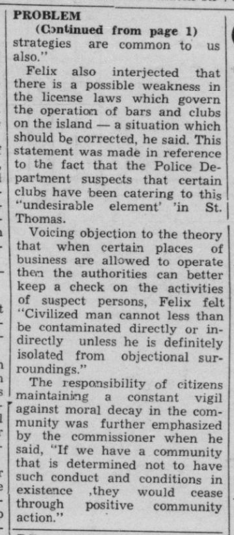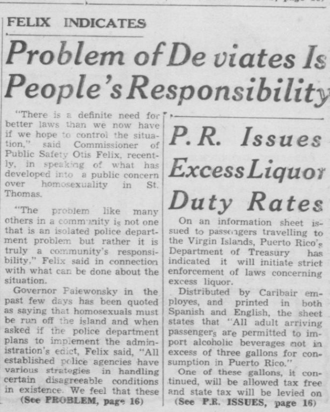 06:28, 4 October 2024 1963-01-11-daily-news-virgin-islands-problem-of-deviates-is-peoples-responsibility-p2.png (file) 166 KB Library of Congress, [https://chroniclingamerica.loc.gov/lccn/sn83025327/1963-01-11/ed-1/seq-14/ "The Daily news of the Virgin Islands., January 11, 1963, Image 14":"Problem (Continued from Page 1)"] The Daily News of the Virgin Islands reports on the investigation of Commissioner Otix Felix into the gay community (January 11, 1963). 1