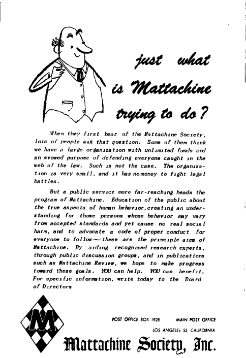 04:58, 2 January 2023 1956-03-mattachine-review-back.png (file) 96 KB Back of the March and April 1956 Mattachine Review copies, a publication of the Mattachine Society. 1