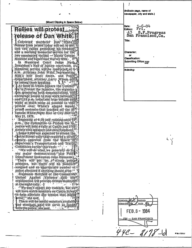 08:12, 1 January 2023 1984-01-06-fbi-harvey-milk-sf-progress-rallies-will-protest-release-of-dan-white.png (file) 140 KB San Francisco Progress, January 6, 1984 "Rallies will protest release of Dan White" 1