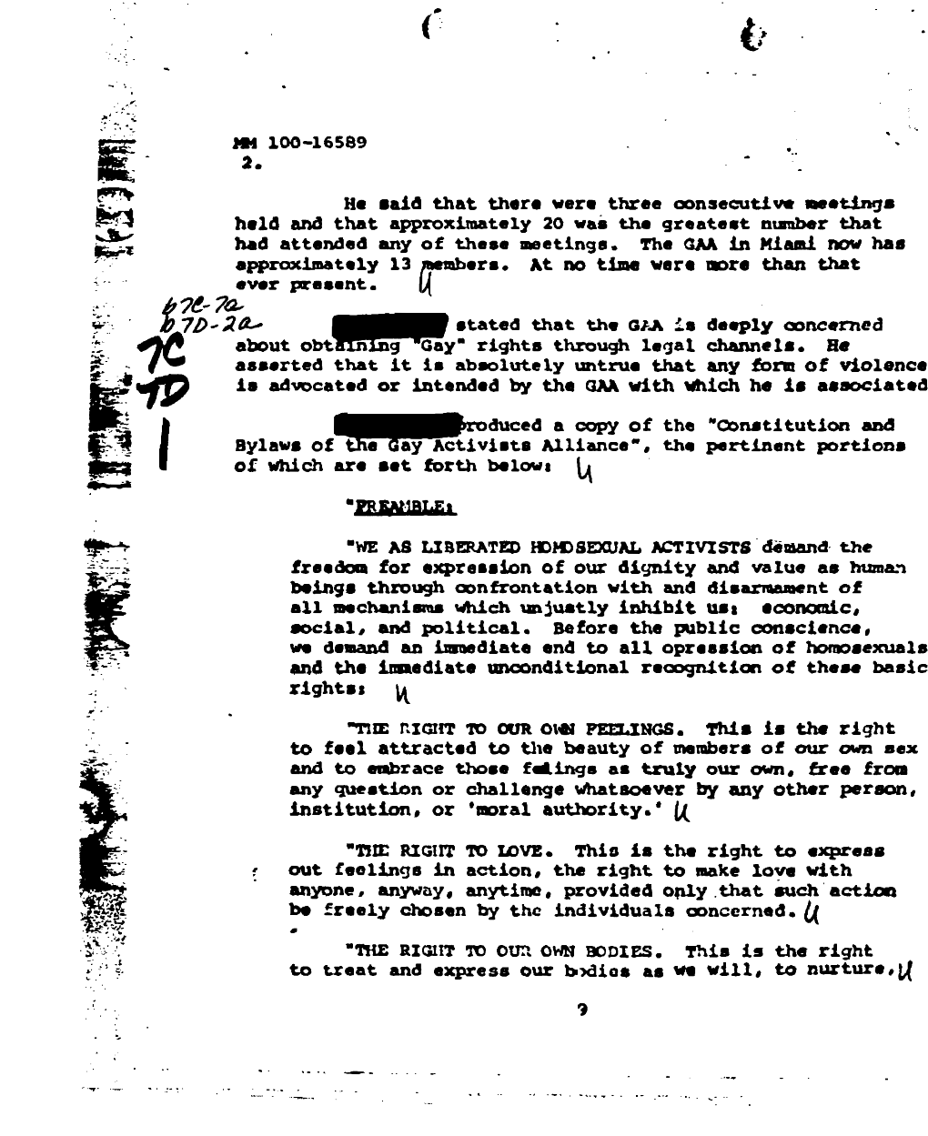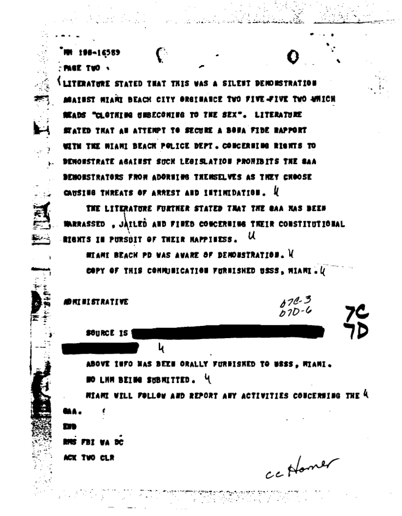 02:55, 13 February 2025 1972-06-05-fbi-memo-gaa-miami-silent-demonstration-page-2.png (file) 113 KB An FBI record describing a protest by the Gay Activists Alliance against Miami Beach City Ordinance 2-55-2. Credit to Douglas M. Charles, Ph.D., FBI historian and author of "Hoover's War on Gays: Exposing the FBI's Sex Deviates Program". == Related Pages == * FBI Activity On LGBTQIA Organizations (USA) * FBI Memo 06-05-1972 Demonstration by Gay Activists Alliance Miami, FBI (Record, June 1972) 1
