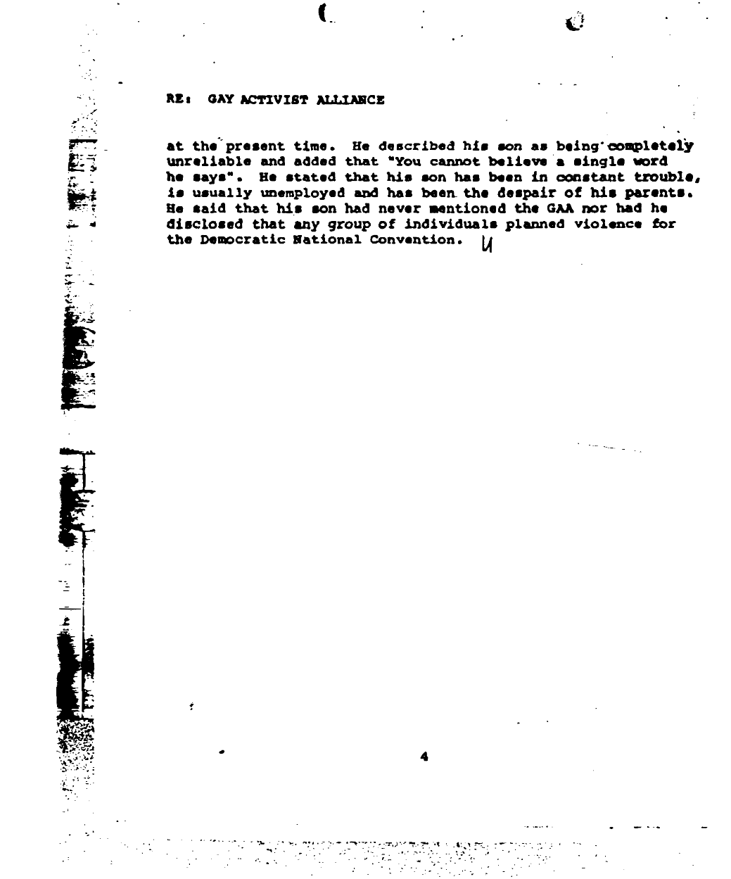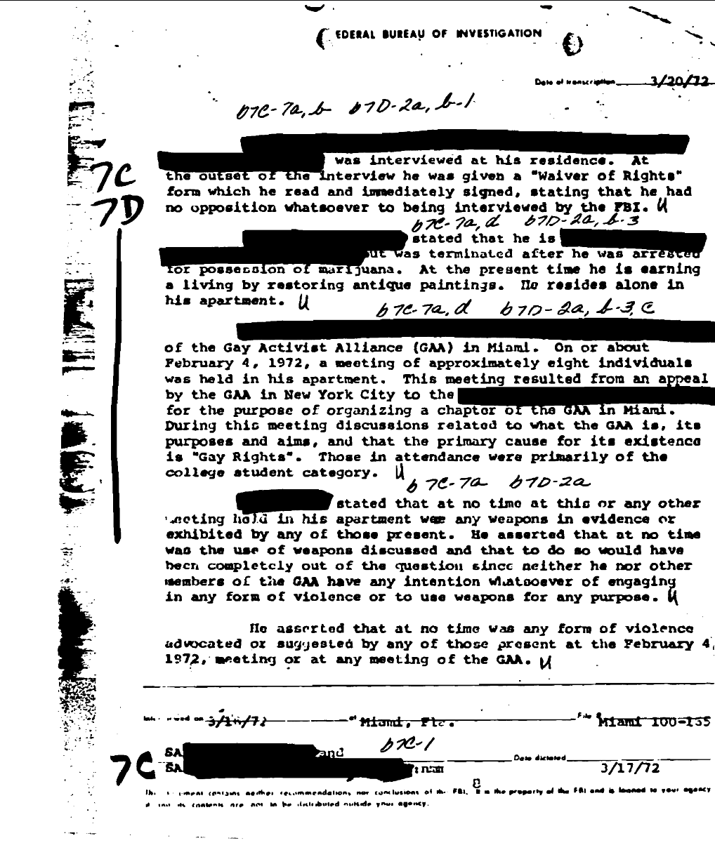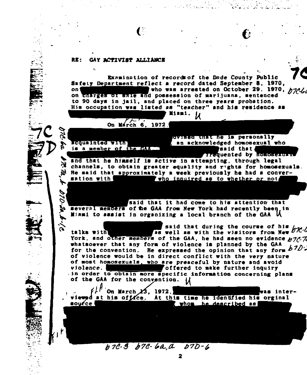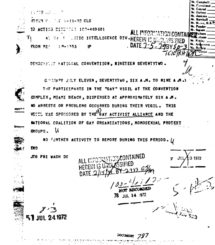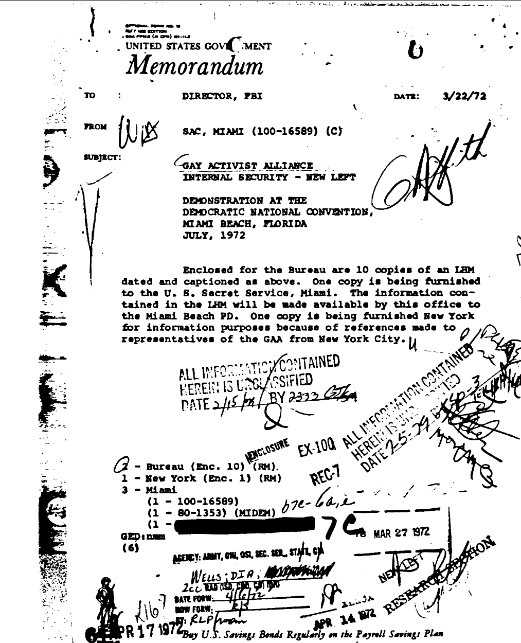 02:55, 13 February 2025 1972-06-05-fbi-memo-gaa-miami-silent-demonstration.png (file) 382 KB An FBI record describing a protest by the Gay Activists Alliance against Miami Beach City Ordinance 2-55-2. Credit to Douglas M. Charles, Ph.D., FBI historian and author of "Hoover's War on Gays: Exposing the FBI's Sex Deviates Program". == Related Pages == * FBI Activity On LGBTQIA Organizations (USA) * FBI Memo 06-05-1972 Demonstration by Gay Activists Alliance Miami, FBI (Record, June 1972) 1