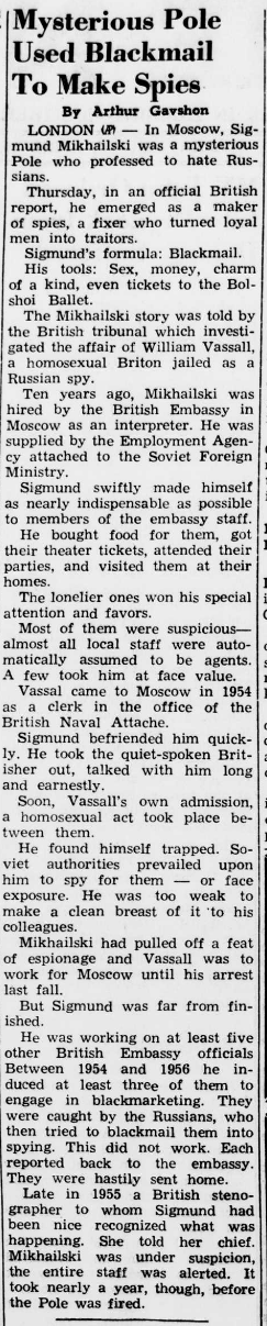16:17, 4 October 2024 1963-04-26-nome-nugget-mysterious-pole-used-blackmail-to-make-spies.png (file) 196 KB Library of Congress, [https://chroniclingamerica.loc.gov/lccn/sn84020662/1963-04-26/ed-1/seq-2/ "The Nome nugget., April 26, 1963, Page 2, Image 2":"Mysterious Pole Used Blackmail To Make Spies"] The Nome Nugget of Alaska reports on alleged use of a gay relationship for blackmail and espionage purposes. 1