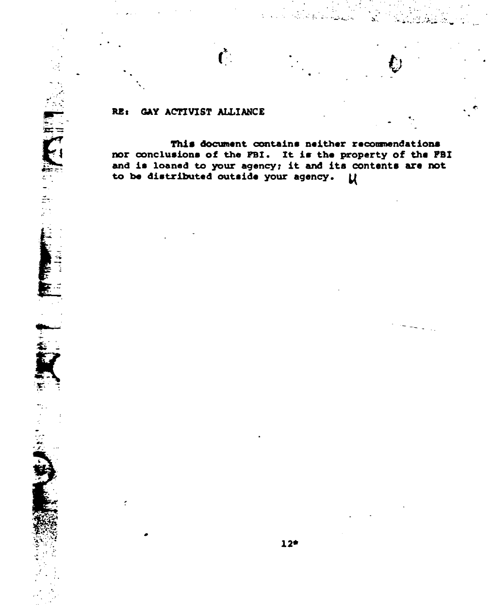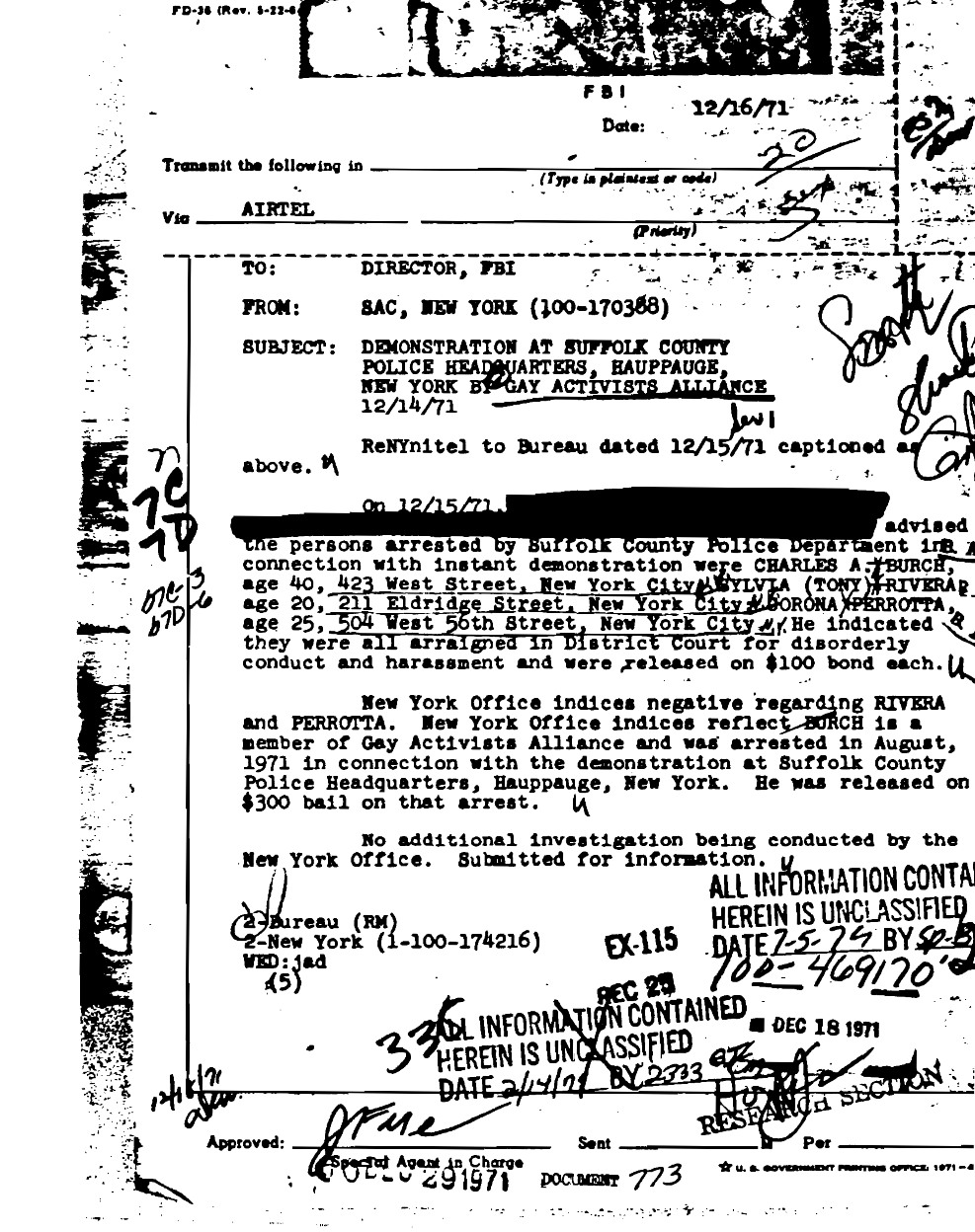 23:08, 16 February 2025 1971-12-16-gaa-protest-suffolk-county-police.png (file) 199 KB An FBI record describing a protest by the Gay Activists Alliance at the Suffolk County Police Headquarters Credit to Douglas M. Charles, Ph.D., FBI historian and author of "Hoover's War on Gays: Exposing the FBI's Sex Deviates Program". 1