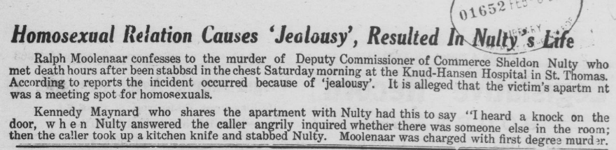 06:10, 4 October 2024 1963-01-10-the-west-end-news-homosexual-relation-causes-jealousy-resulted-in-nultys-life.png (file) 121 KB Library of Congress, [https://chroniclingamerica.loc.gov/lccn/sn84037548/1963-01-10/ed-1/seq-1/ "The West end news., January 10, 1963, Image 1": "Homosexual Relation Causes 'Jealousy', Resulted in Nulty's Life"] The West End News of the Virgin Islands reports on a murder that occurred potentially between queer individuals (January 10, 1963). 1