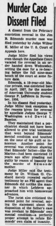 The Evening Star, a newspaper in Washington D.C., remarks on Judge Wilbur K. Miller of the U.S. court of Appeals commenting on a case argument invoking gay panic defense, "the testimony... merely repeated earlier testimony by an FBI agent that Edmonds did not like the manner in which Lefebvre approached him with homosexual advances" (April 18, 1957).